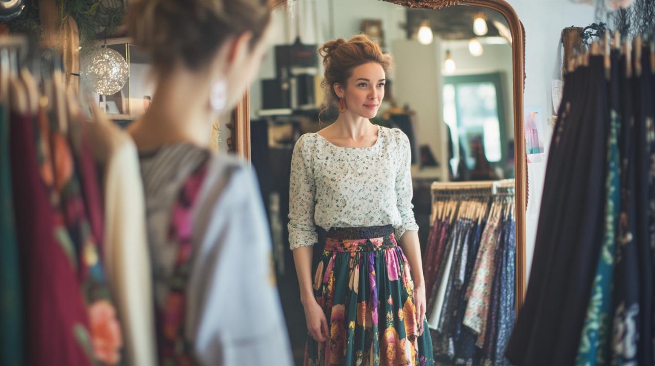 Le choix des matières influence également l’effet visuel de votre jupe. Les tissus fluides comme la soie ou la viscose créent du mouvement et adoucissent les silhouettes anguleuses, tandis que les matières structurées comme le denim ou le cuir apportent de la tenue et sculptent la silhouette. Les tendances printemps-été 2025 mettent en avant la légèreté avec des couleurs pastel et vives ainsi que des imprimés floraux, tandis que l’hiver privilégie les couleurs profondes comme le bordeaux et le vert forêt, accompagnées de motifs texturés tels que les carreaux et les imprimés animaliers. La jupe à taille haute constitue un incontournable pour toutes les morphologies, car elle structure visuellement la silhouette et allonge les jambes.